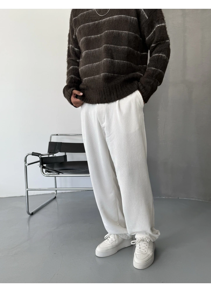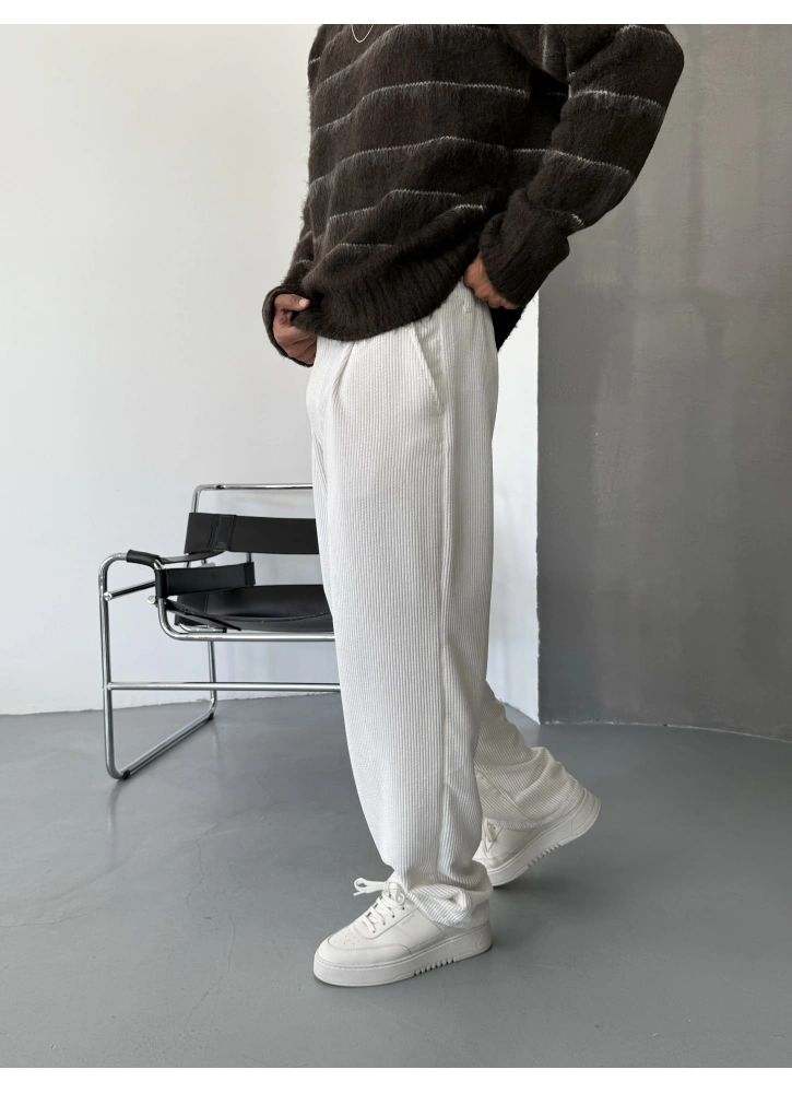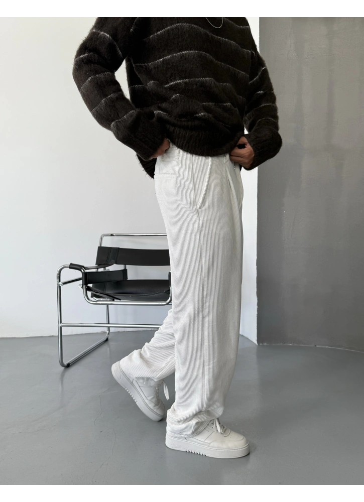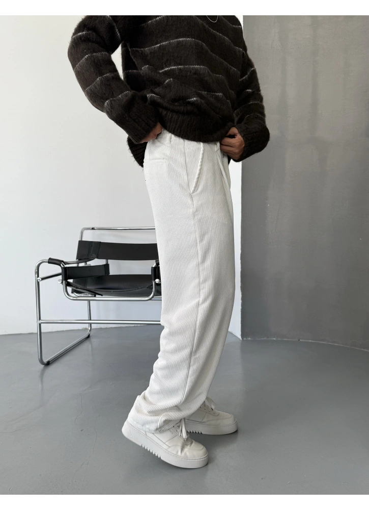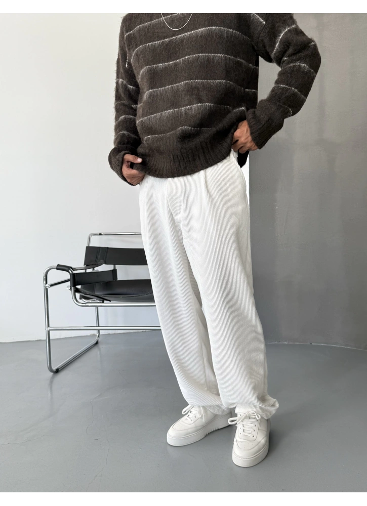 Yumuşacık kadife dokusu ve bol kalıbıyla konforu ön planda tutan bu baggy pantolon, beyaz rengin zarif görünümüyle stilinizi tamamlar. Günlük kombinlerden sokak modasına kadar geniş kullanım imkânı sunar. Modern ve salaş kesimi sayesinde rahatlıkla öne çıkar.