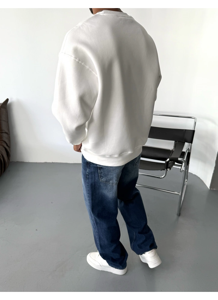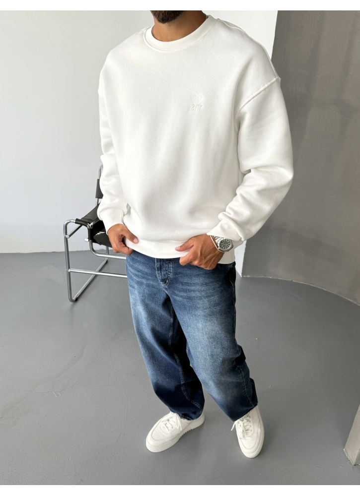 Beyaz Premium Bisiklet Yaka Sweatshirt