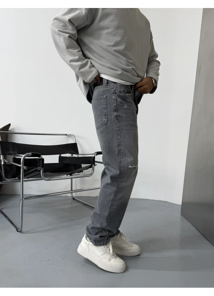 Gri Eskitme Yırtık Detay Baggy Jean, eskitme yıkaması ve yırtık detaylarıyla modern bir sokak stili sunar. Baggy kalıbı sayesinde rahat ve güçlü bir duruş sağlar. Günlük ve streetwear kombinleri için idealdir.
