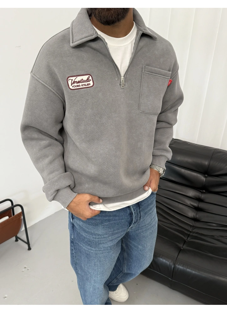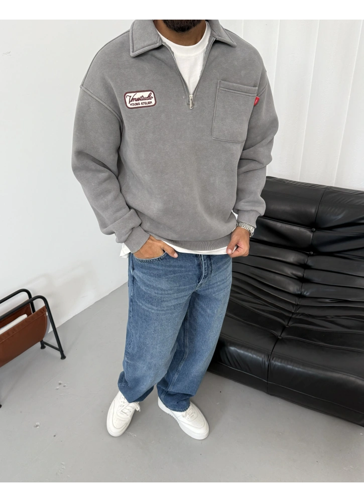 Gri Yıkamalı Yarım Fermuar Oversize Sweat Hakkında