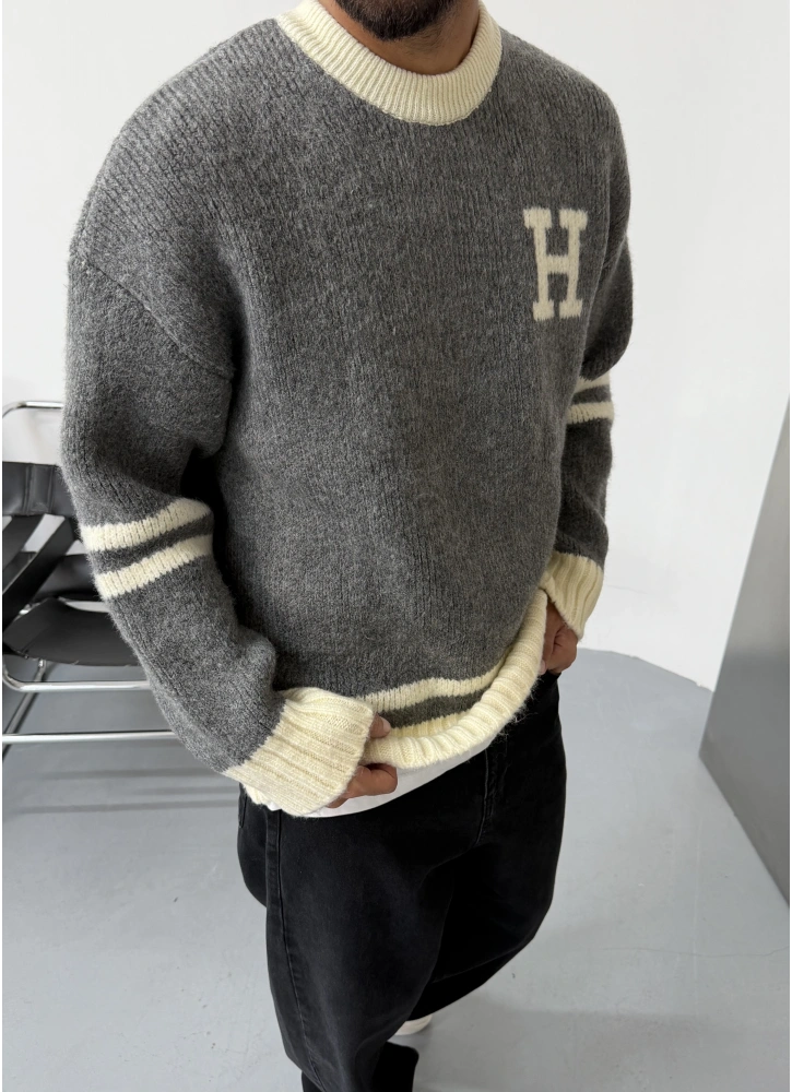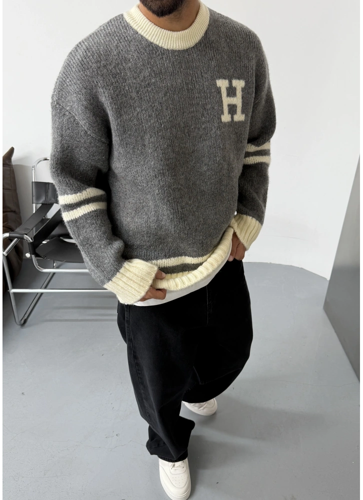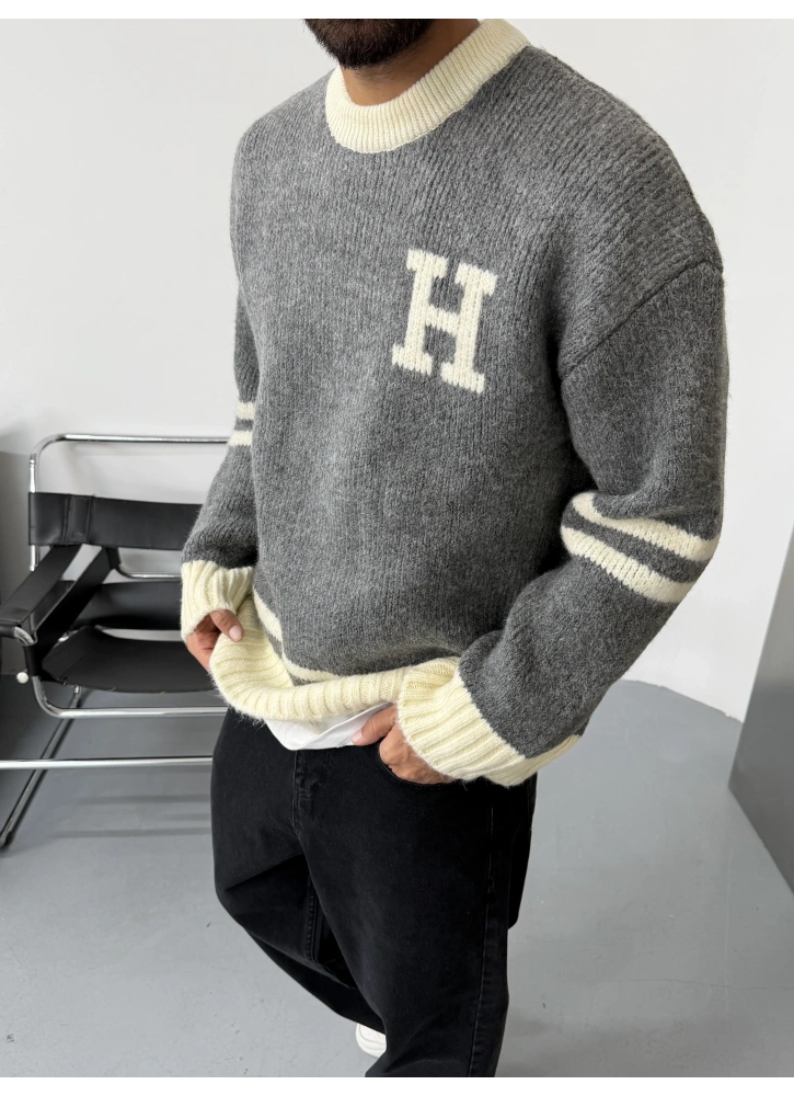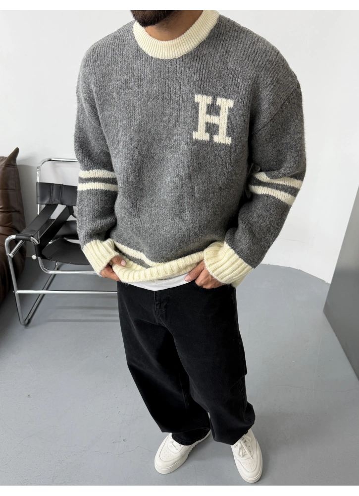 H Baskılı Gri Oversize Triko Kazak Hakkında