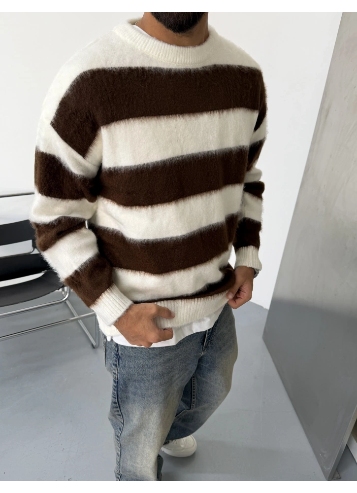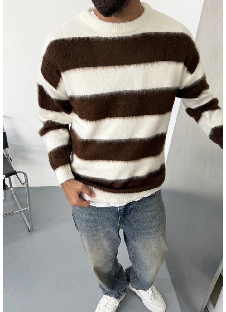 Çizgili deseni ve oversize kalıbıyla modern sokak stiline sıcak bir dokunuş katan bu triko kazak, rahat yapısıyla gün boyu konfor sunar. Kahve tonları sayesinde zamansız ve kolay kombinlenebilir; günlük kullanımda ve şehir stilinde güçlü bir görünüm sağlar.