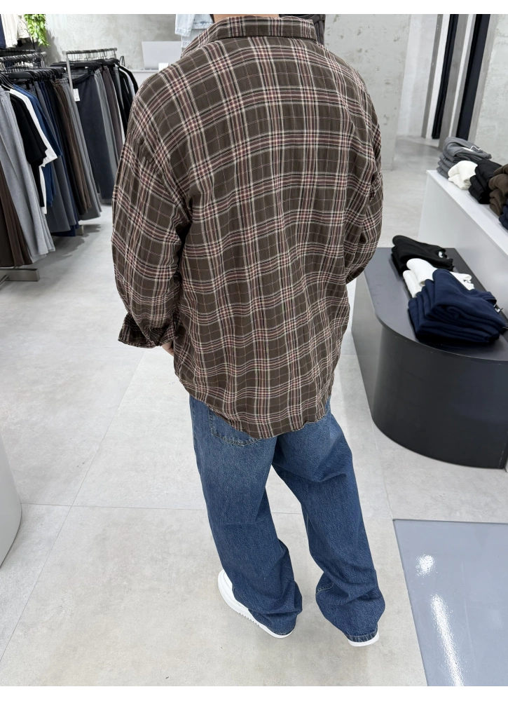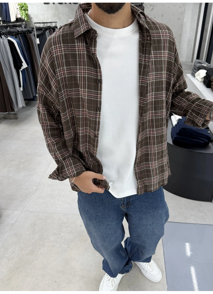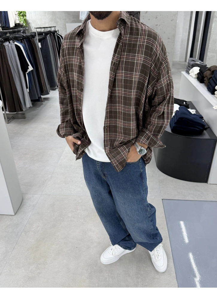 Kahve Kareli Pamuk Kumaş Oversize Gömlek