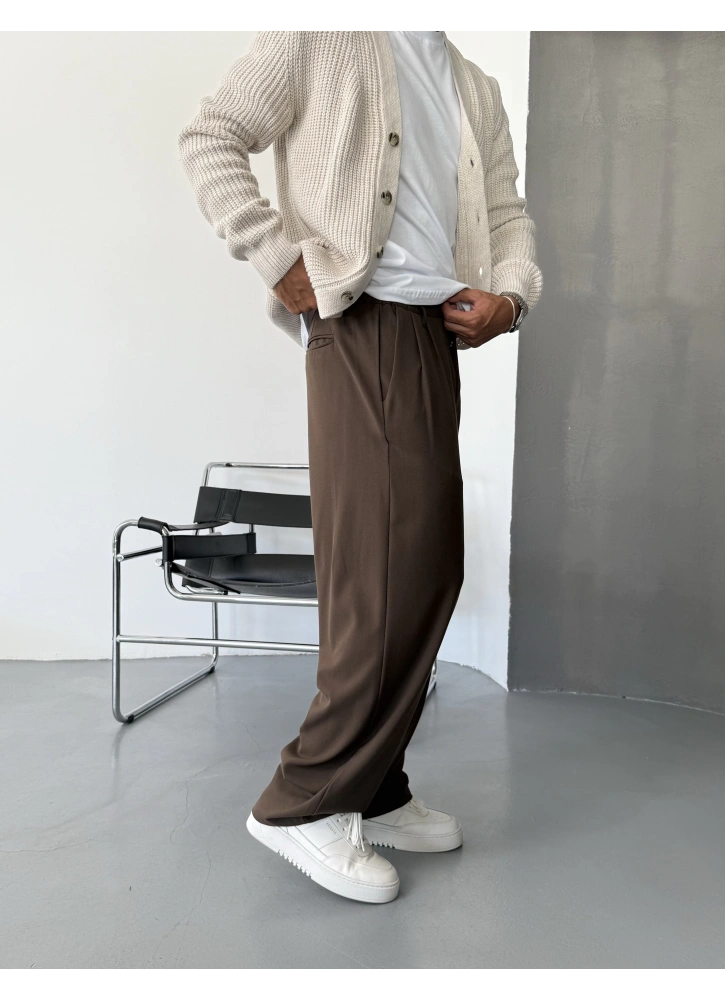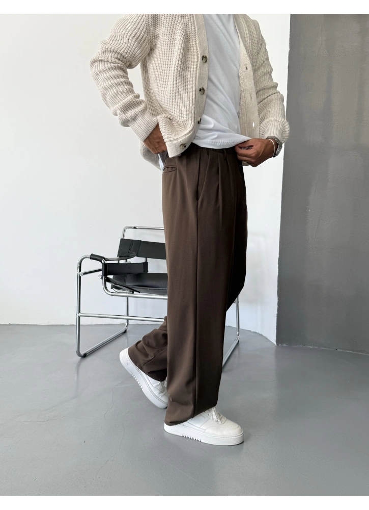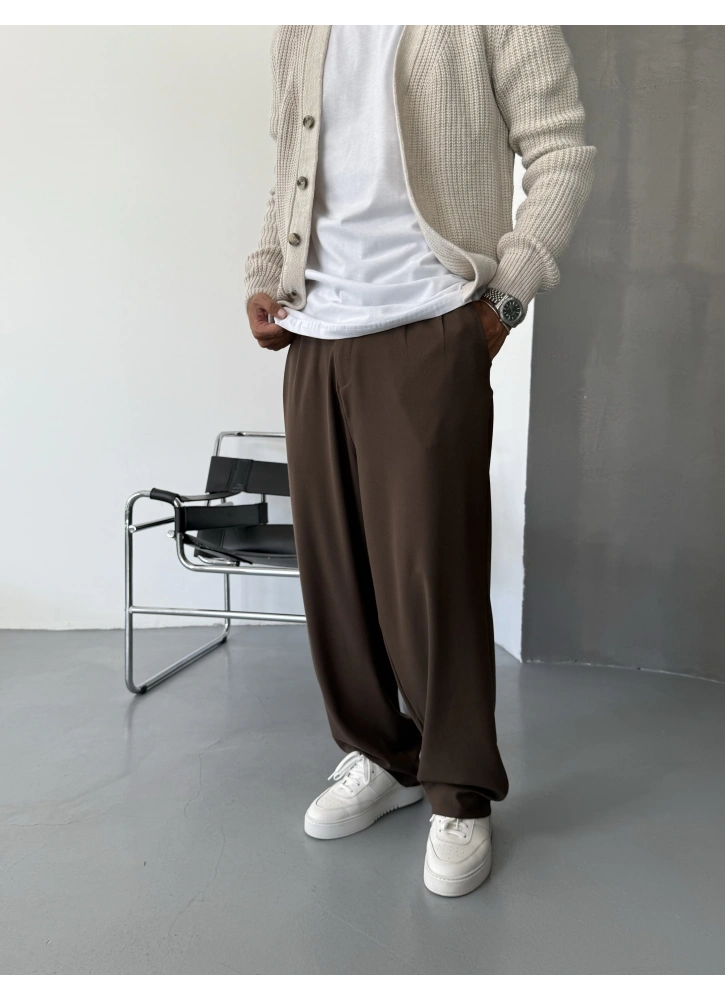 Kahve Pileli Kumaş Baggy Pantolon