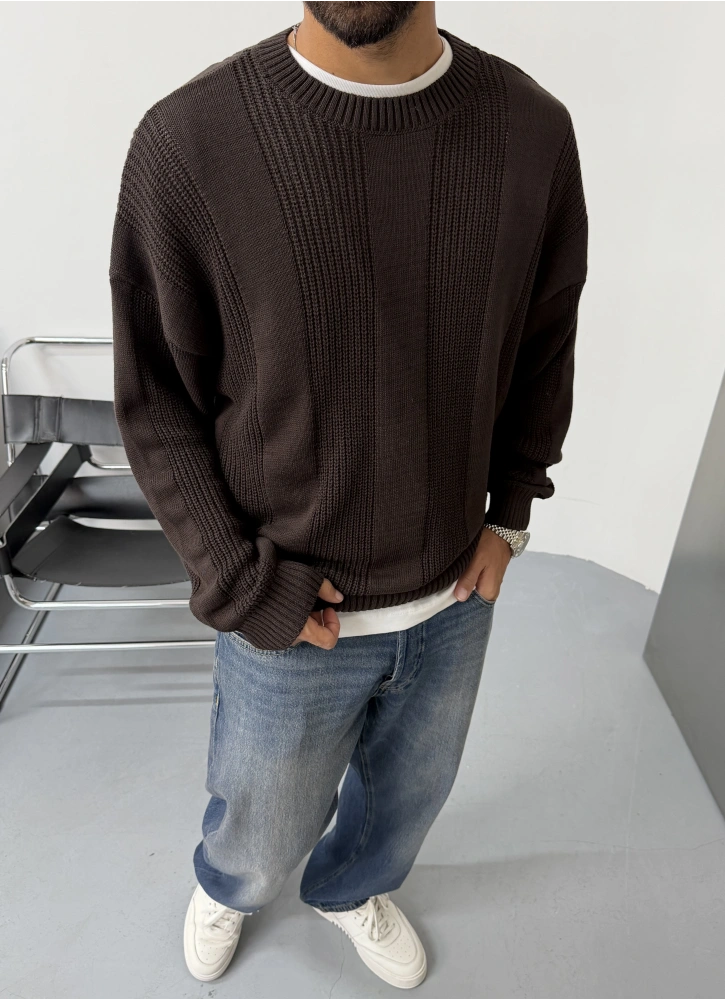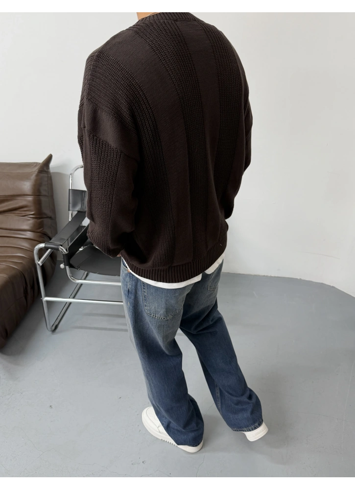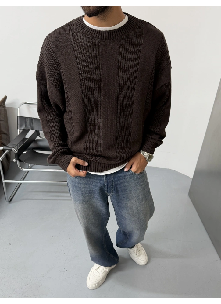 Kahve Şerit Detay Oversize Triko Kazak