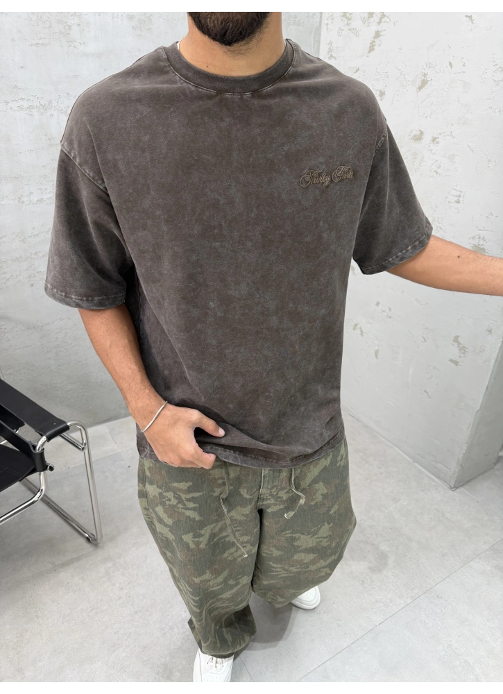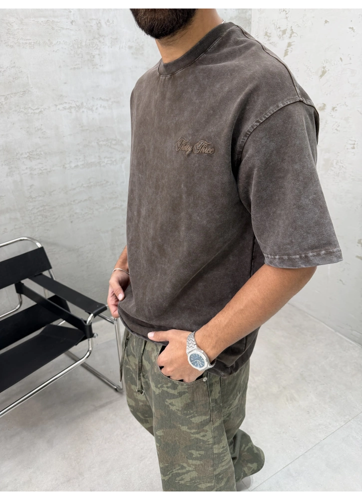 Kahve Yıkamalı 33 İşlemeli Oversize T-Shirt Hakkında