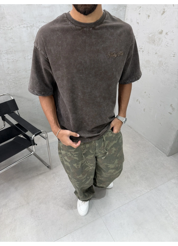Kahve Yıkamalı 33 İşlemeli Oversize T-Shirt