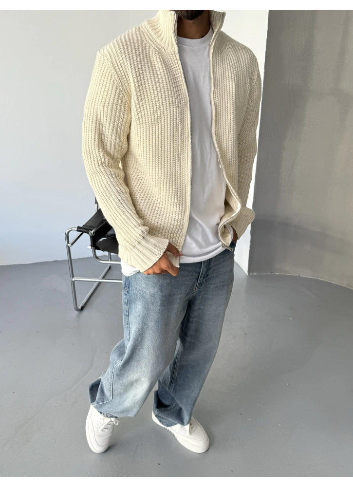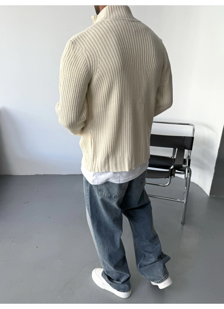 Krem Dik Yaka Fermuarlı Triko