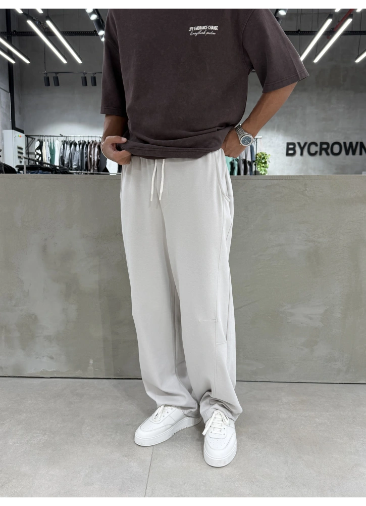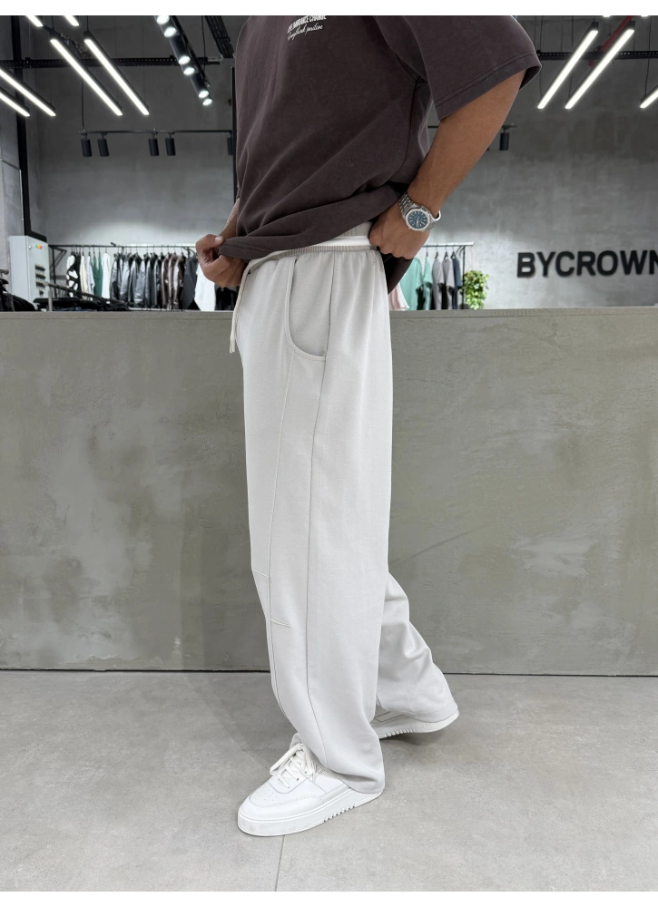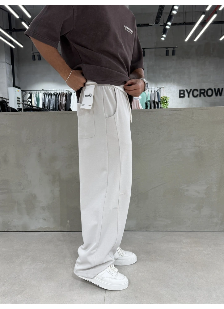 Krem yıkamalı dokusu ve etiket detayıyla öne çıkan bol kalıp eşofman.