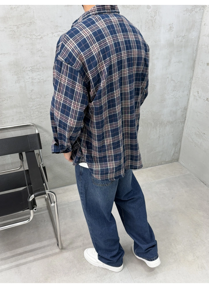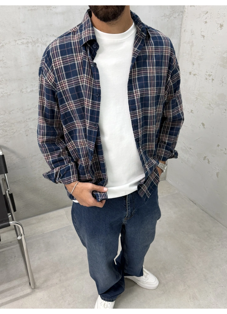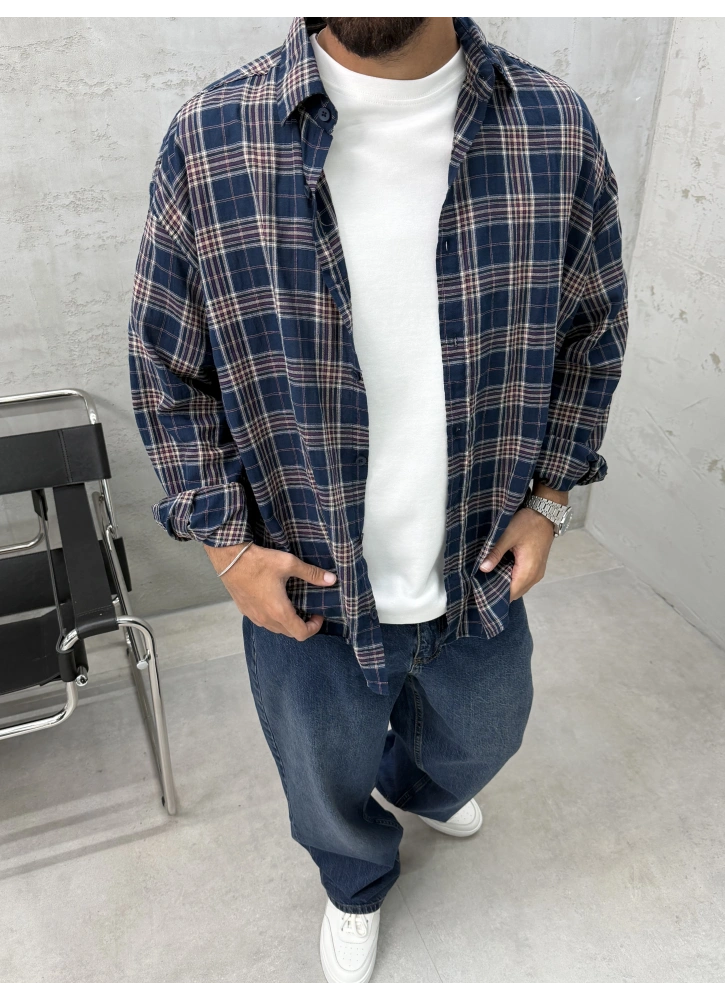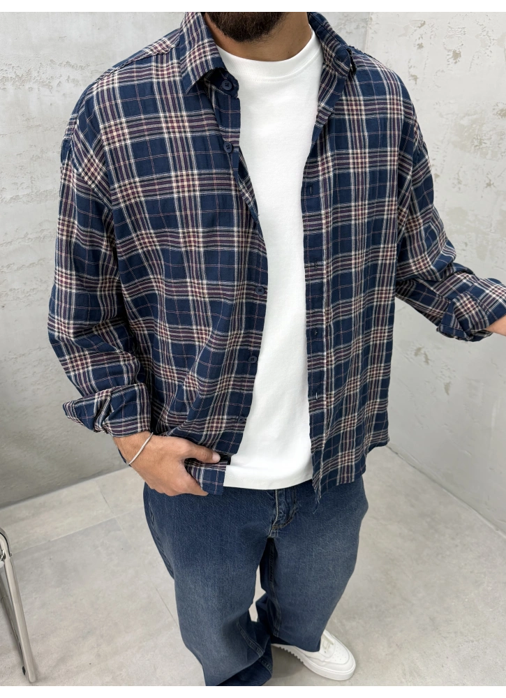 Lacivert Kareli Pamuk Kumaş Oversize Gömlek