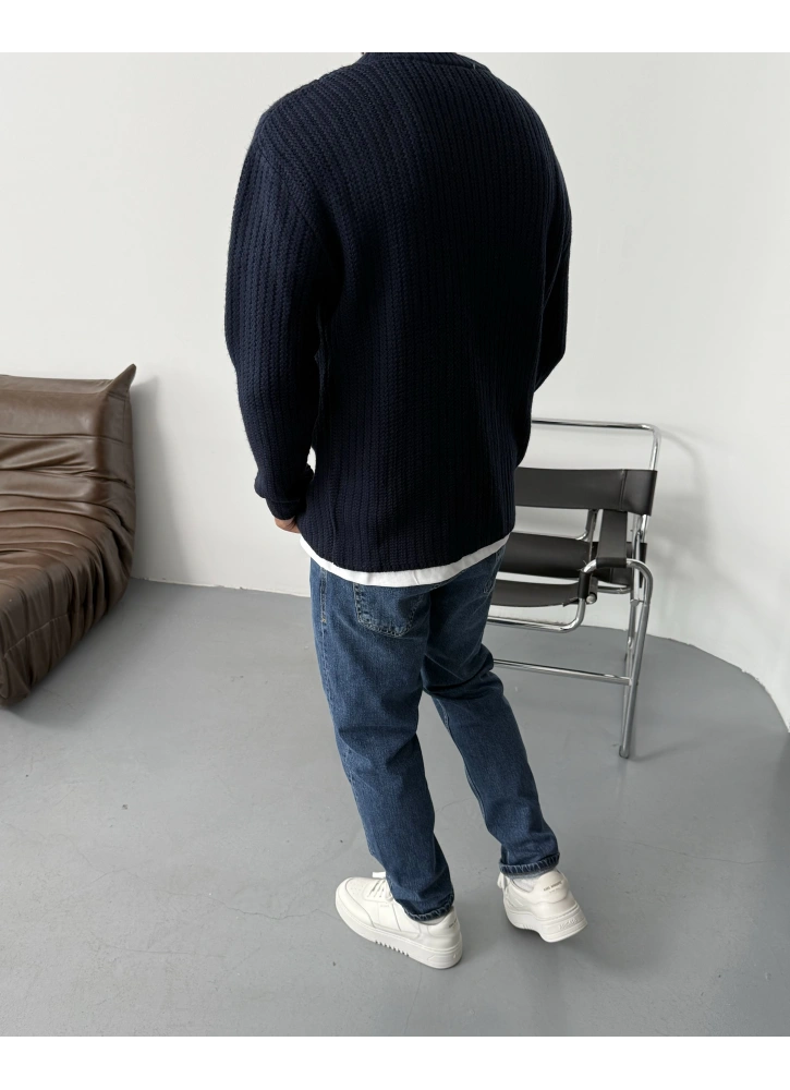 Kalın örme dokusu ve basic tasarımıyla zamansız bir görünüm sunar. Lacivert tonu ile her mevsime uyum sağlayan bu kazak, hem rahat hem de şık bir duruş oluşturur. Tok yapısı sayesinde formunu korur ve günlük giyimde konforu ön plana çıkarır.