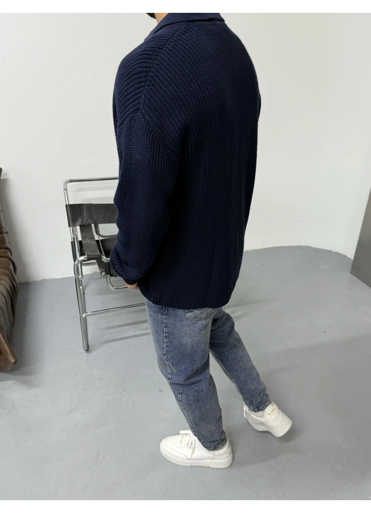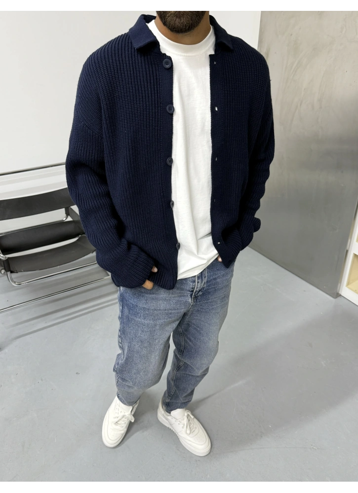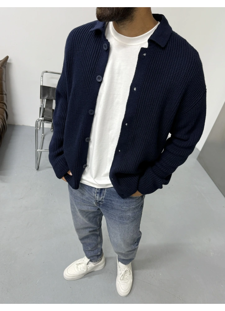 Lacivert tonunun zamansız şıklığını oversize kesimle buluşturan bu örme düğmeli hırka, hem sıcak tutan dokusuyla hem de modern duruşuyla günlük stile güçlü bir dokunuş sağlar. Katmanlı kombinlerde rahat, cool ve premium bir görünüm sunar.