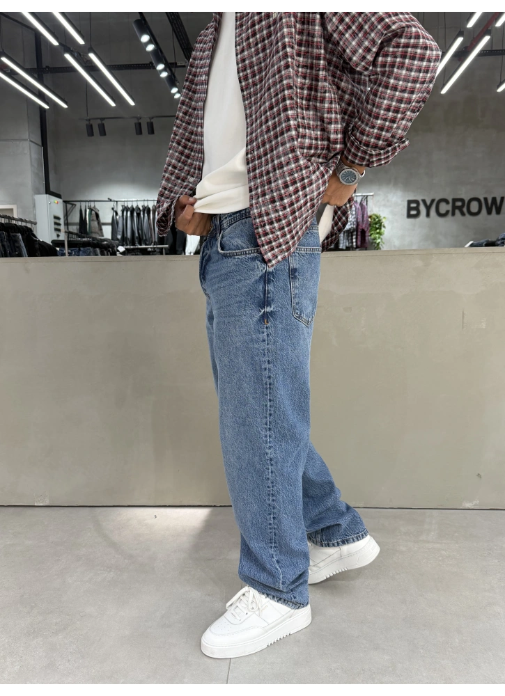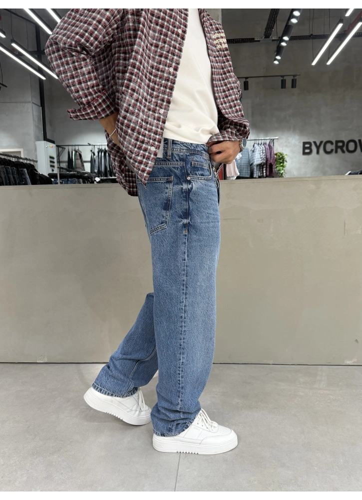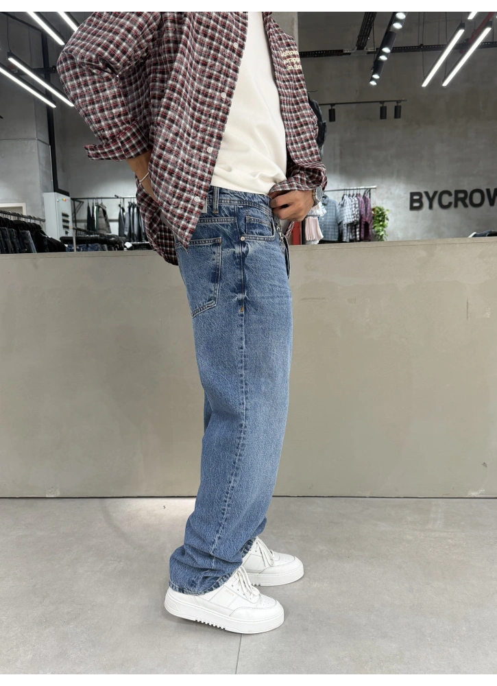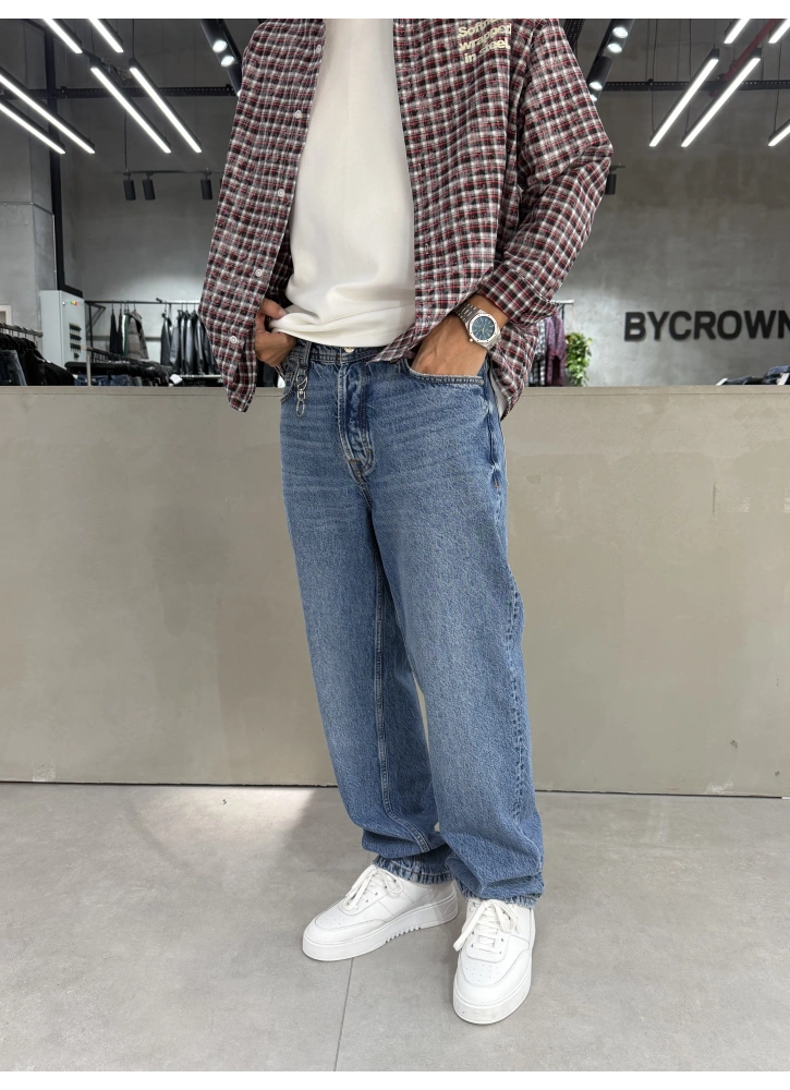 Mavi tonu ve dikkat çeken aksesuar detaylarıyla öne çıkan bu baggy jean, bol kalıbıyla gün boyu konfor sunar. Modern street style çizgisiyle kombinlerine özgün ve iddialı bir hava katar.