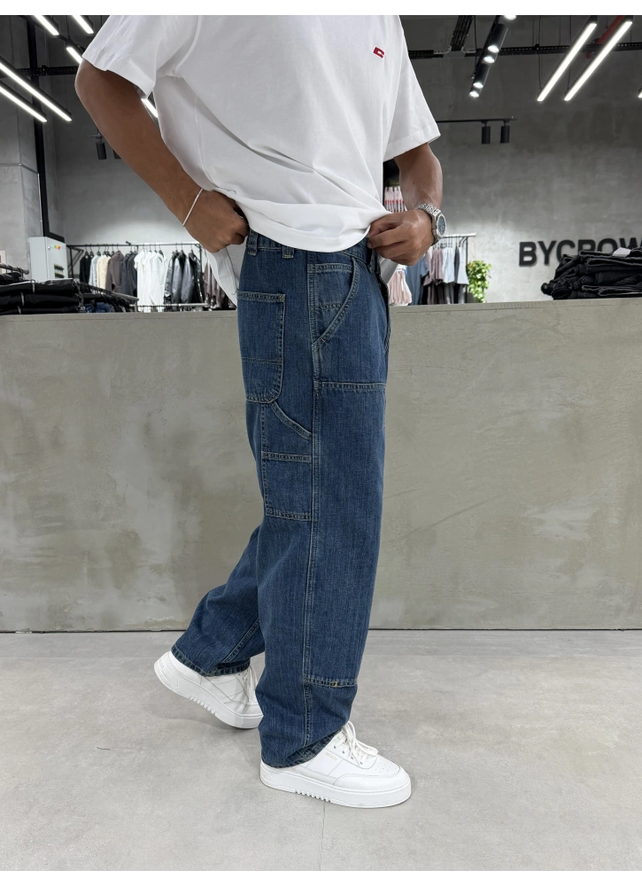 Mavi denim kumaşı ve dikkat çeken dikiş detaylarıyla öne çıkan bol kalıp baggy jean, rahat kesimiyle gün boyu konfor sunar. Modern street style görünümüyle günlük kombinlere güçlü bir karakter katar.
