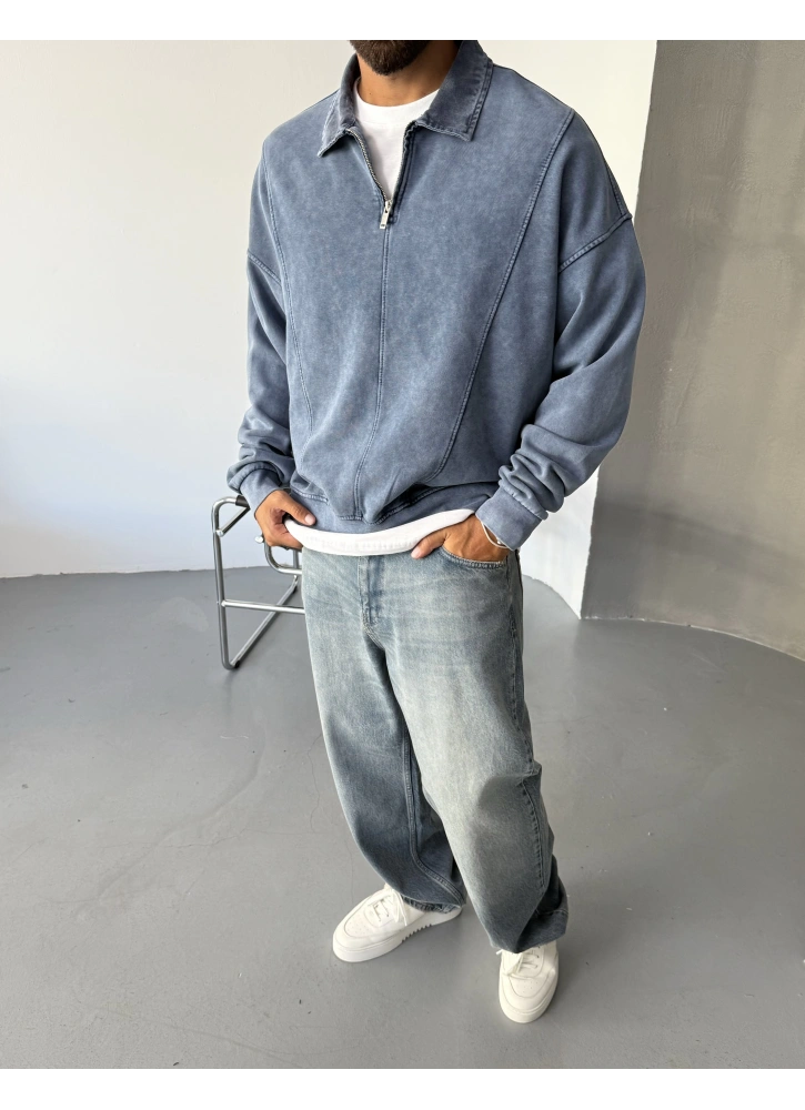 Mavi Yıkamalı Yarım Fermuar Sweatshirt Hakkında