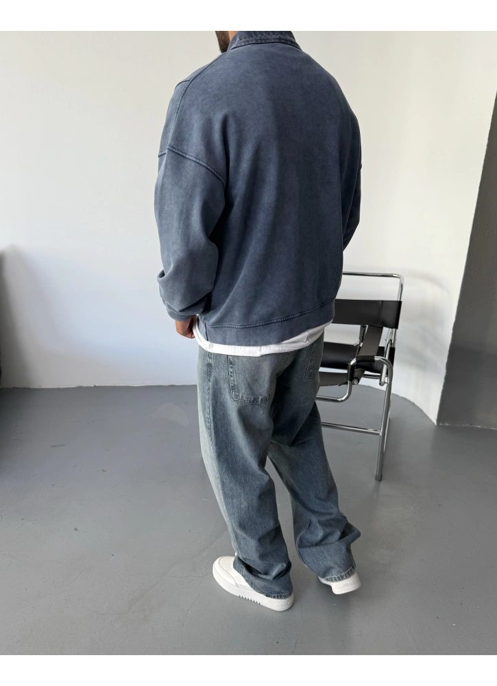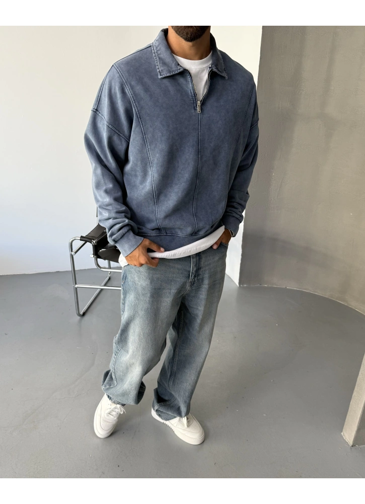 Mavi Yıkamalı Yarım Fermuar Sweatshirt