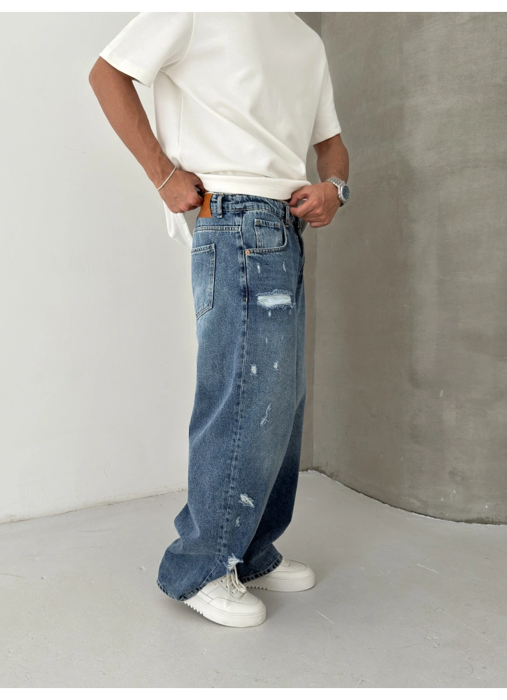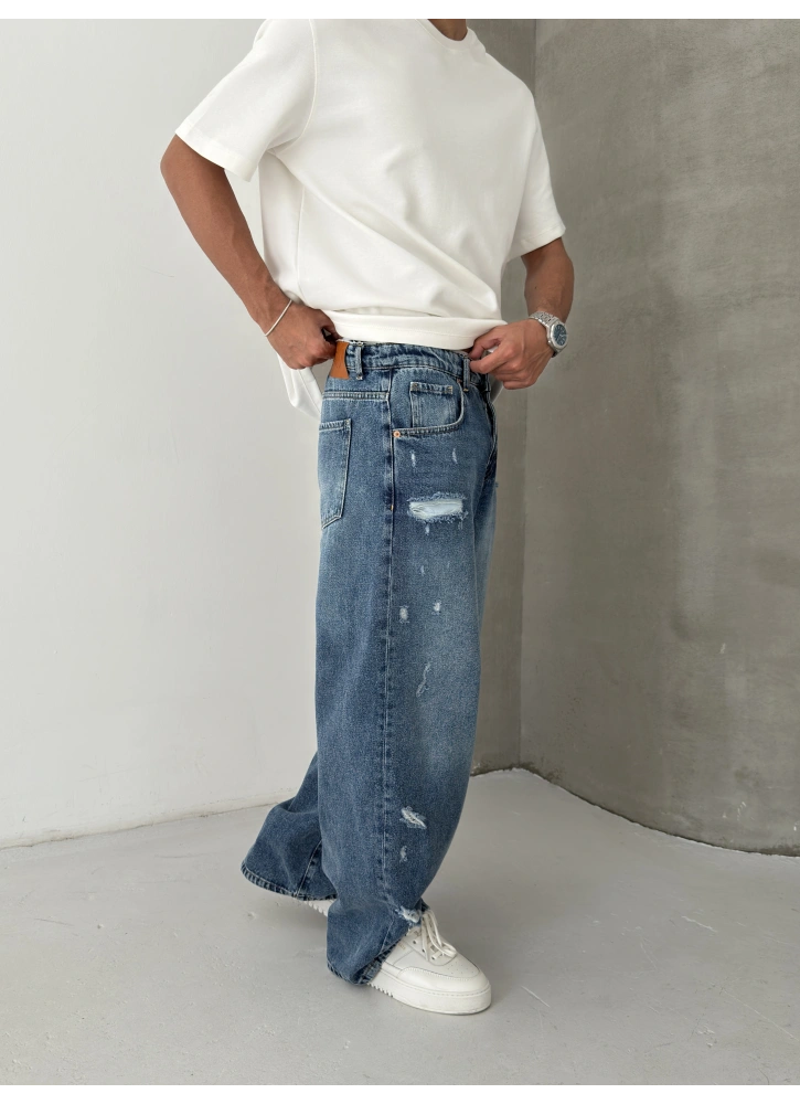 Mavi tonu ve dikkat çeken yırtık detaylarıyla öne çıkan bu süper baggy, ekstra bol kalıbıyla maksimum konfor sunar. Dinamik ve iddialı tasarımıyla kombinlerine güçlü, cool ve stil sahibi bir hava katar.