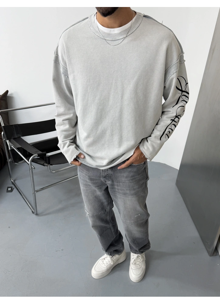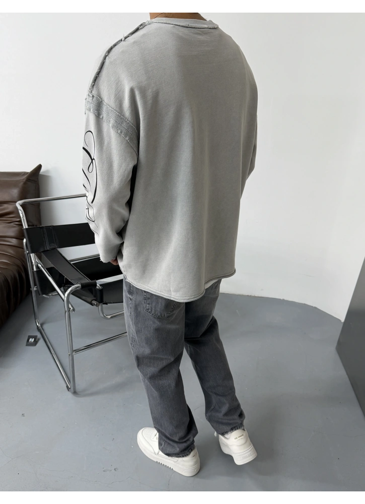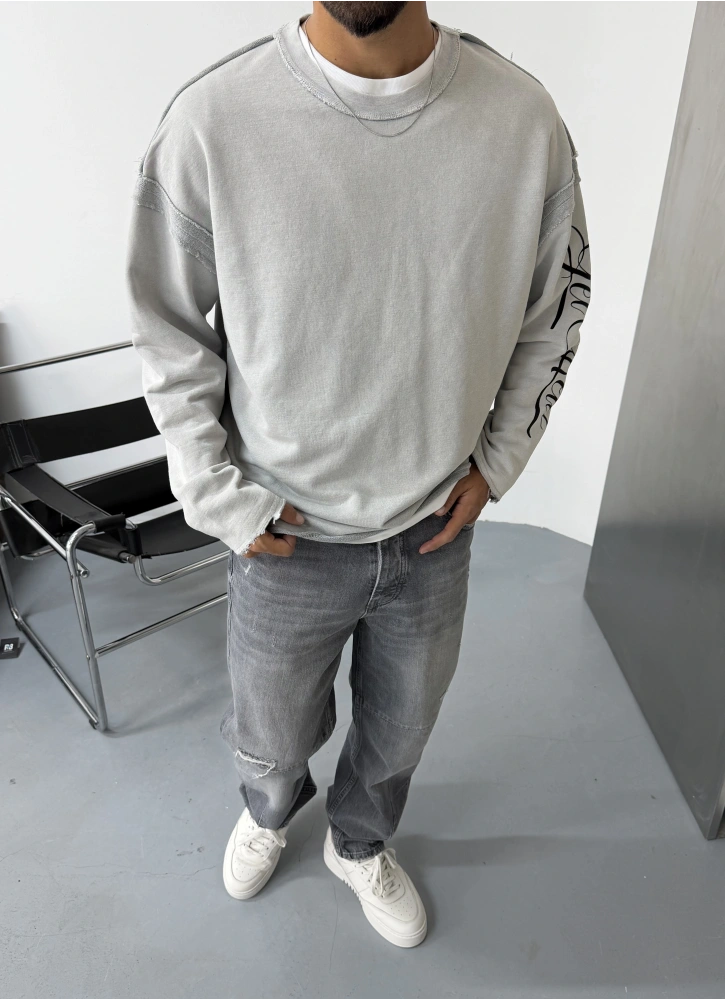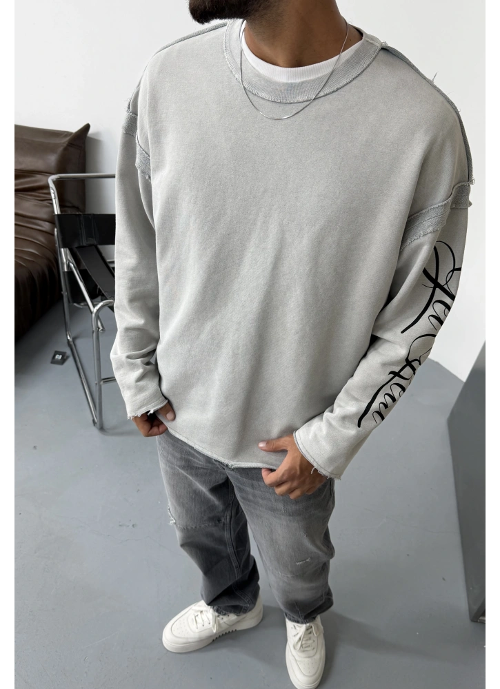 Gri Yıkamalı Kol Baskılı Oversize Sweat Hakkında