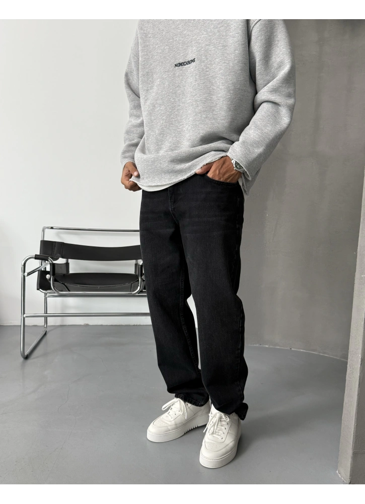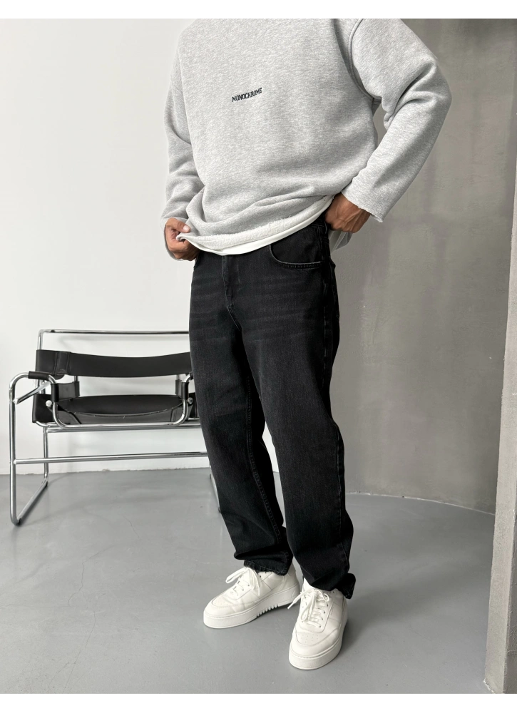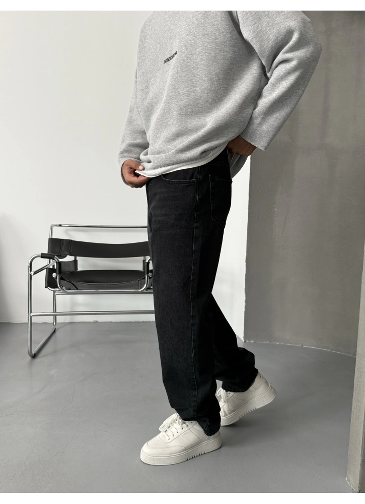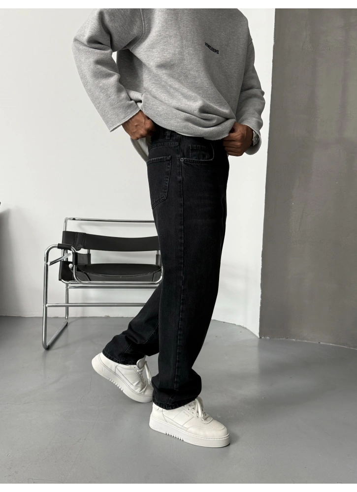 Siyah Eskitme Denim Baggy Jean, modern şehir stilinin en güçlü parçalarından biri.