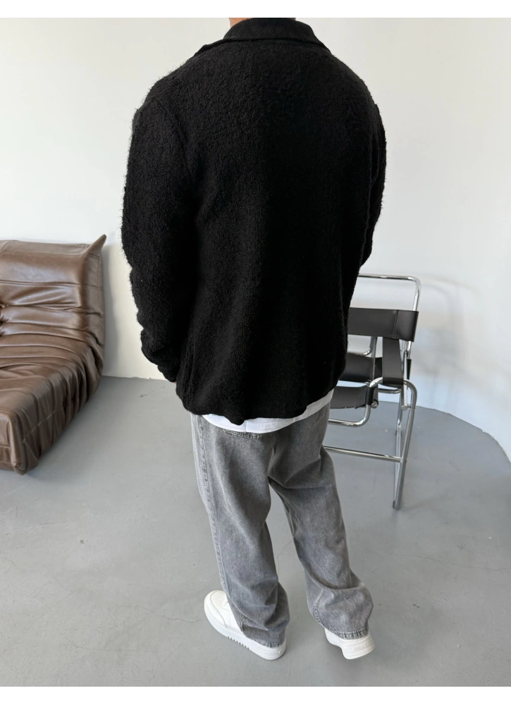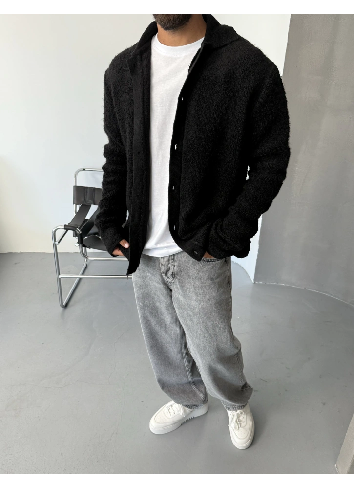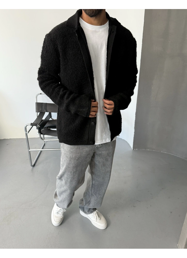Siyah oversize düğmeli hırka, yumuşak dokusu ve rahat kalıbıyla günlük kombinlere şıklık katar.