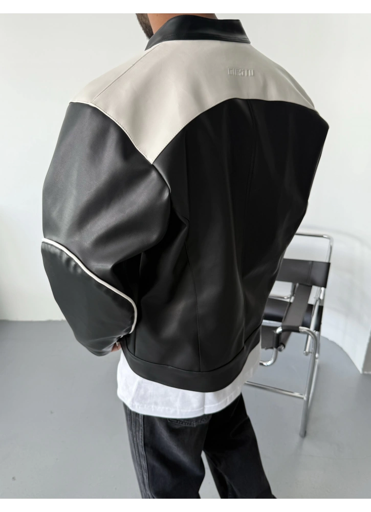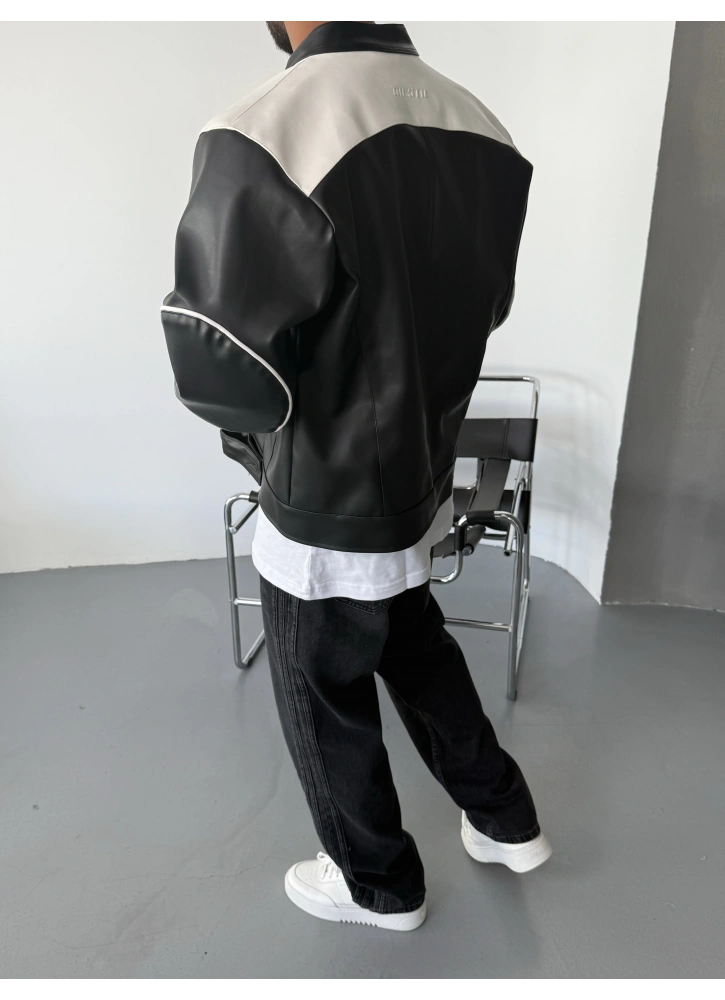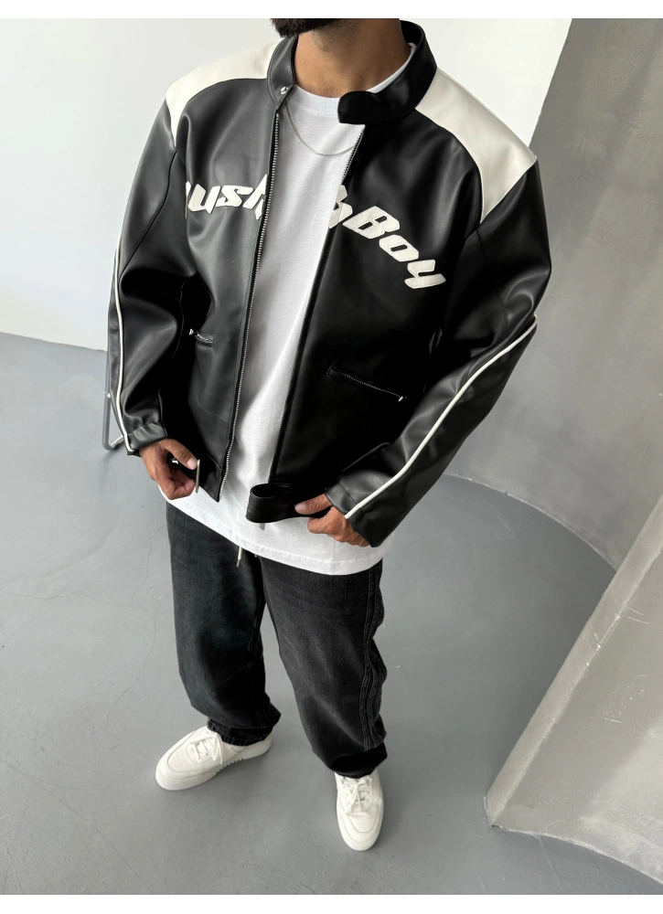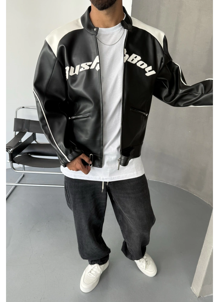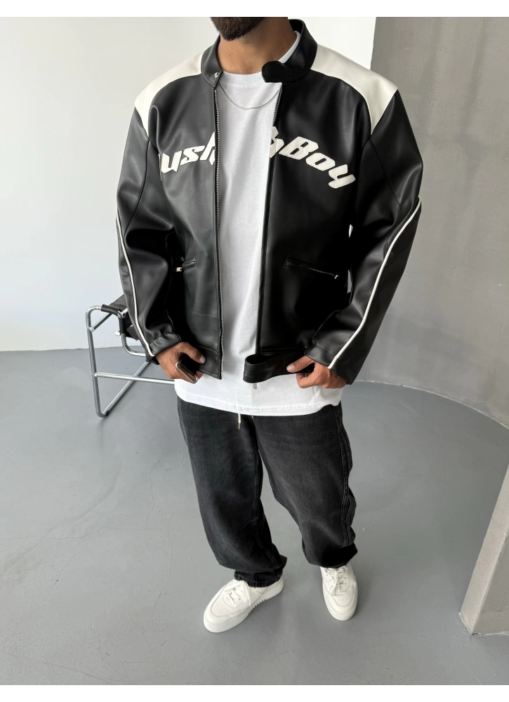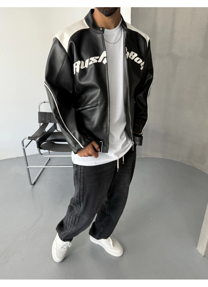 Klasik siyahın güçlü havasını biker kesimle buluşturan bu ceket, modern baskı detaylarıyla dikkat çekiyor. Kaliteli suni deri dokusu sayesinde hem dayanıklı hem de konforlu bir kullanım sunar. Oversize kalıbı ve fermuar detaylarıyla sokak stilinde özgün bir tarz yaratır.