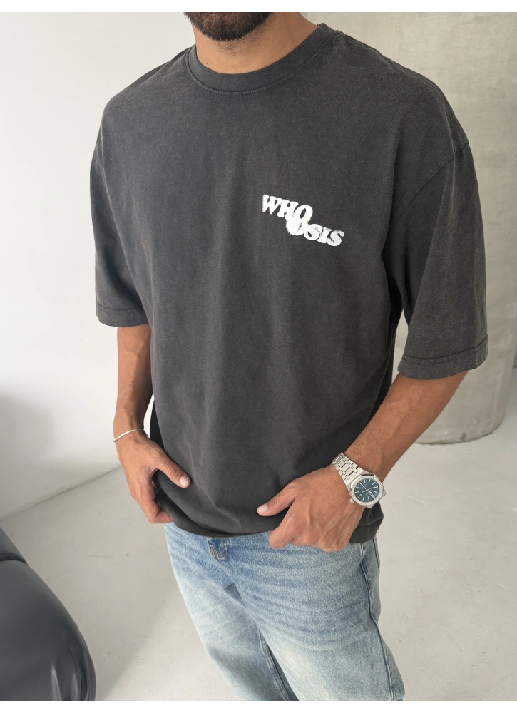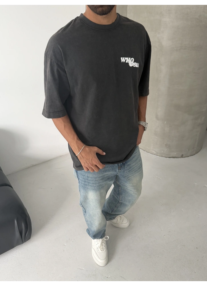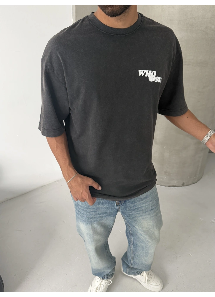 Siyah yıkamalı kumaşı ve dikkat çeken “Who” detayıyla öne çıkan bu oversize t-shirt, geniş kesimiyle gün boyu konfor sunar. Güçlü duruşu ve modern tasarımıyla kombinlerine cool ve stil sahibi bir hava katar.