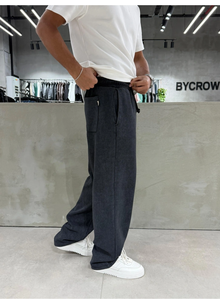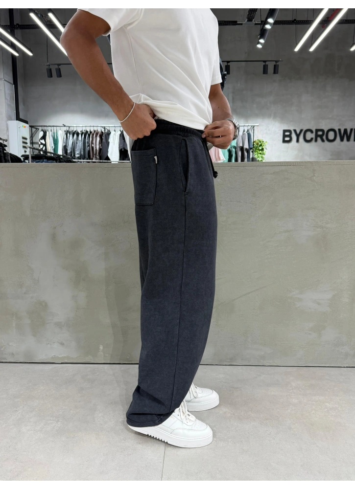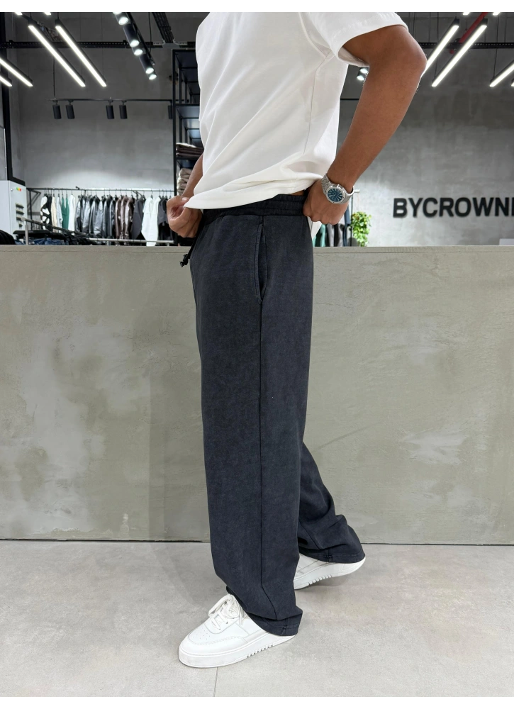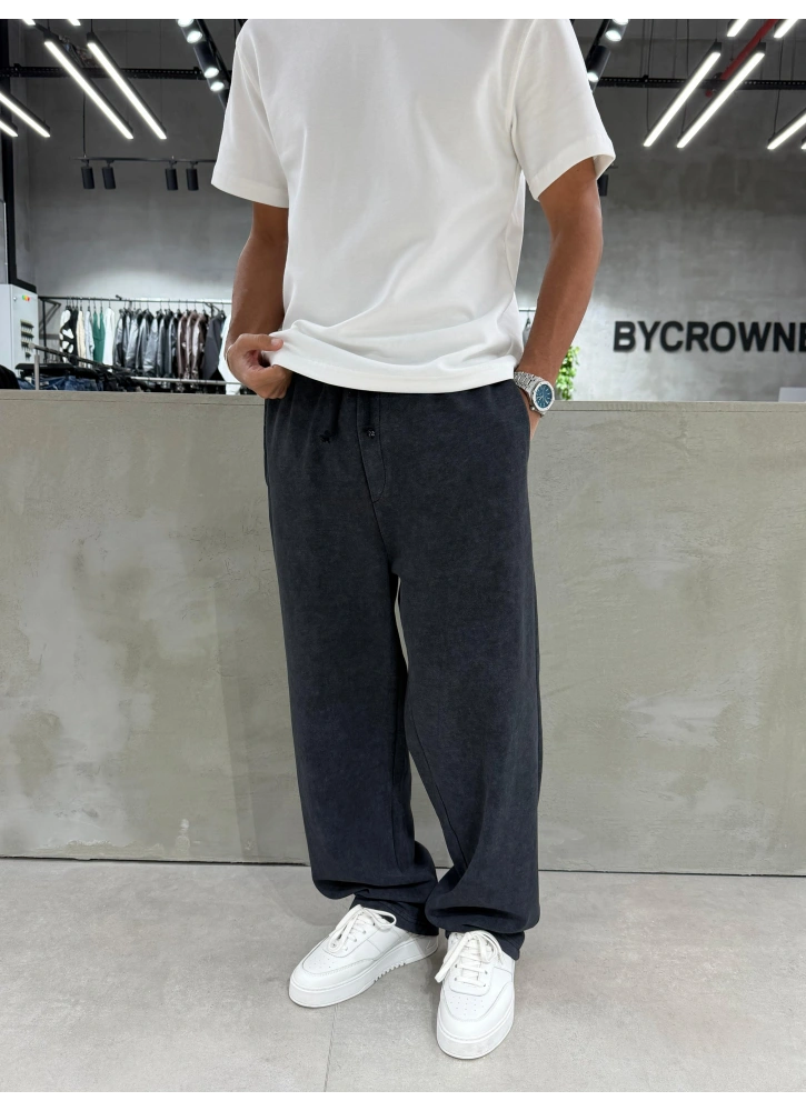 Siyah yıkamalı kumaşıyla sade ama karakterli bir görünüm sunan bu bol kalıp eşofman, rahat kesimi sayesinde gün boyu konfor sağlar. Basic tasarımıyla her kombinle uyum yakalayarak günlük stiline modern ve cool bir hava katar.