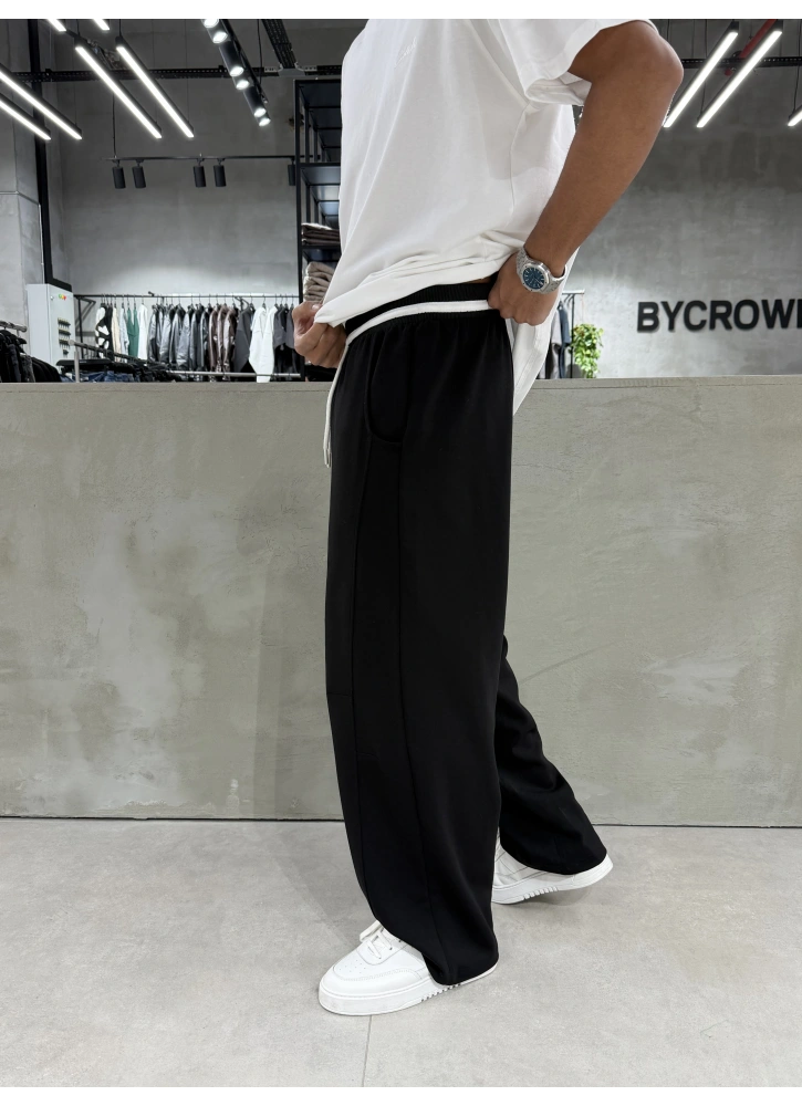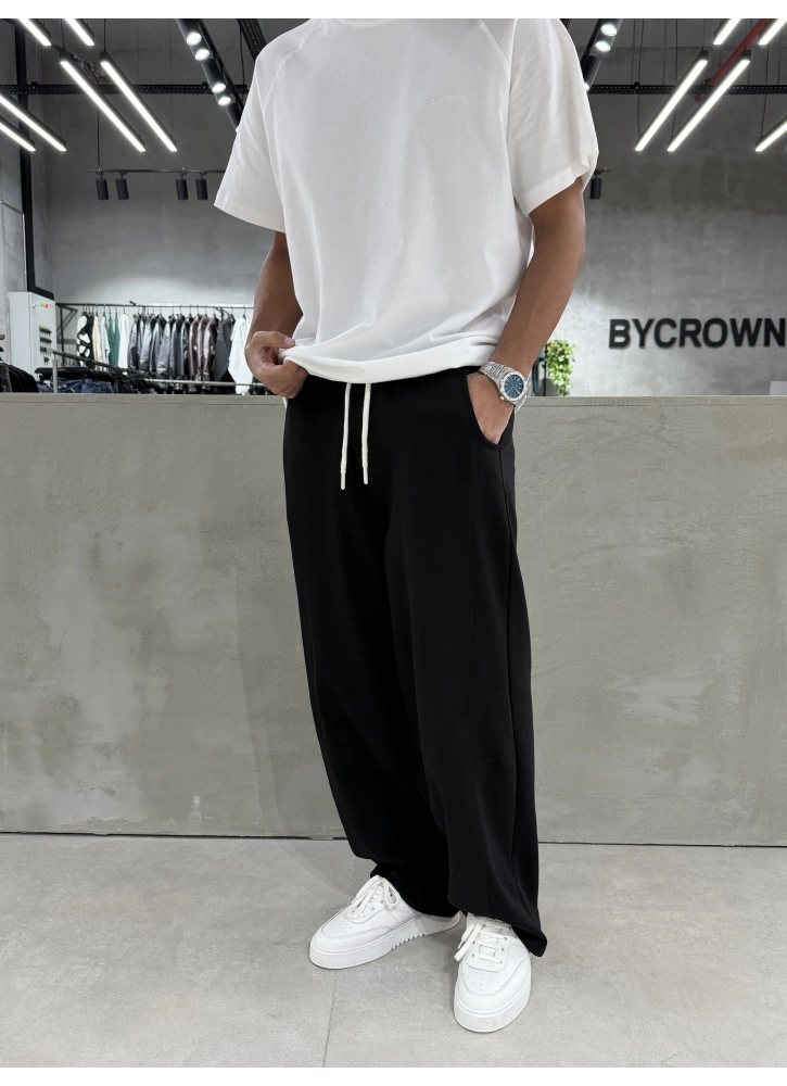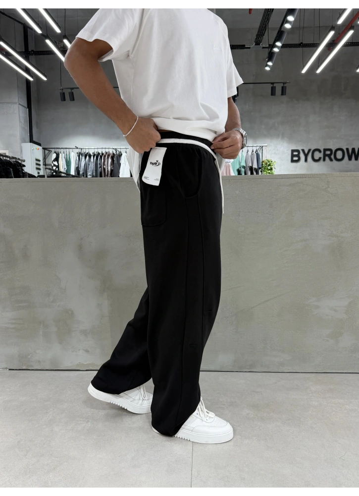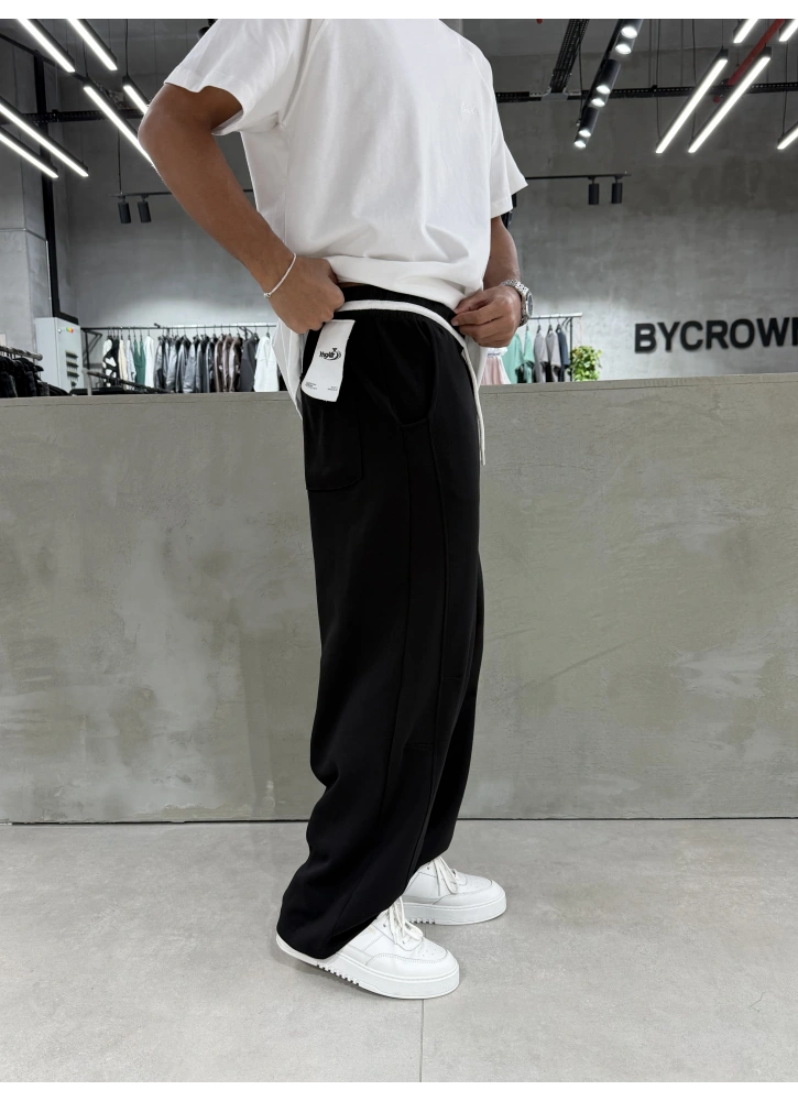 Siyah yıkamalı dokusu ve etiket detayıyla öne çıkan bol kalıp eşofman.