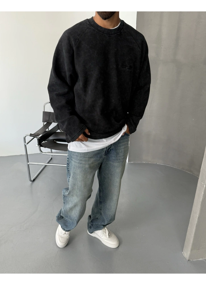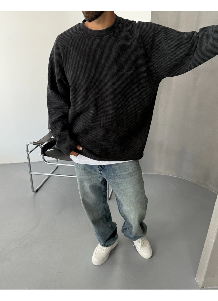 Siyah Yıkamalı Gofre Kumaş Sweatshirt
