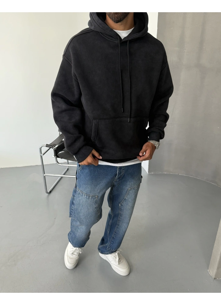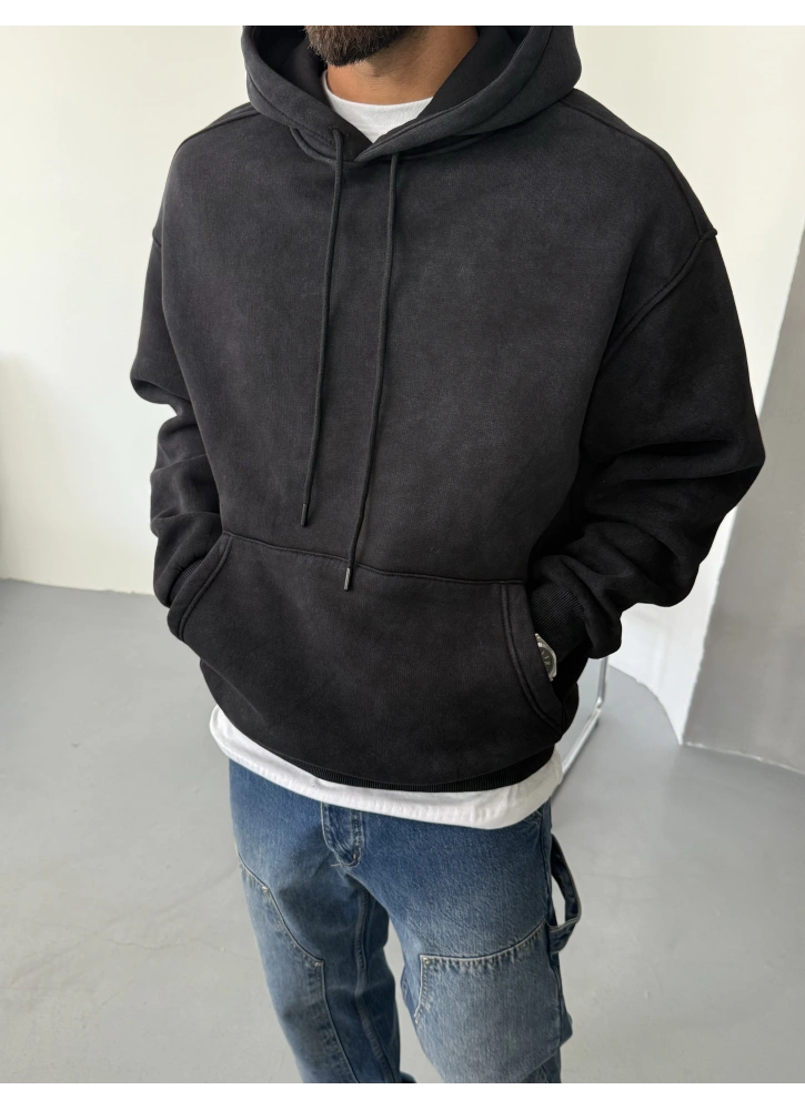 Siyah Yıkamalı Oversize Kapüşonlu Sweat %100 Pamuk