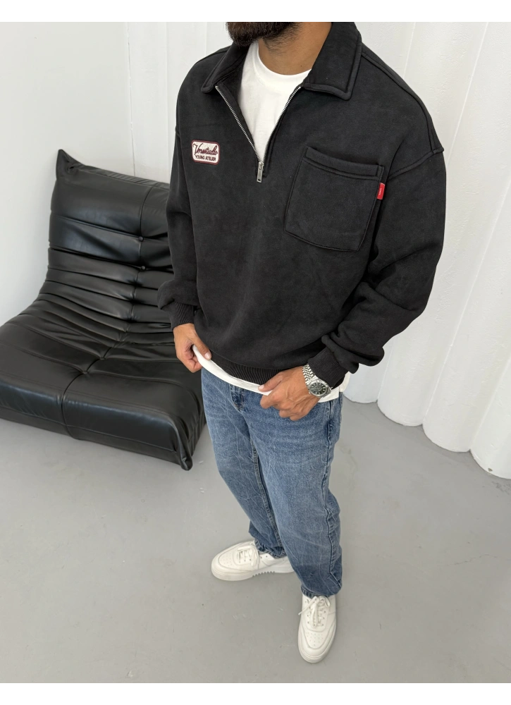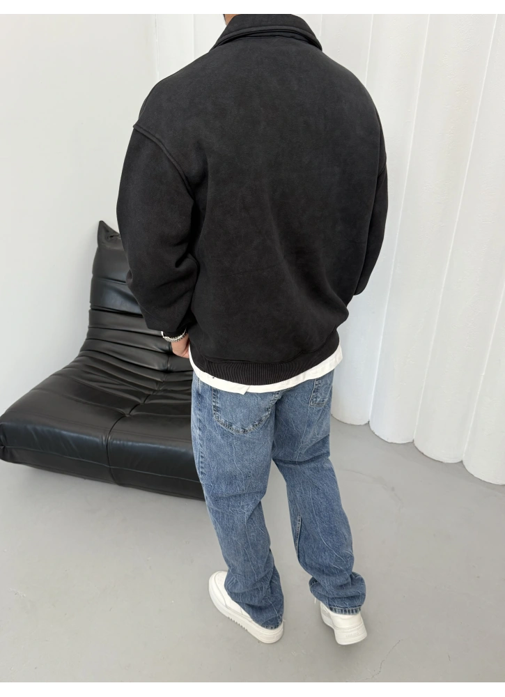 Siyah Yıkamalı Yarım Fermuar Oversize Sweat