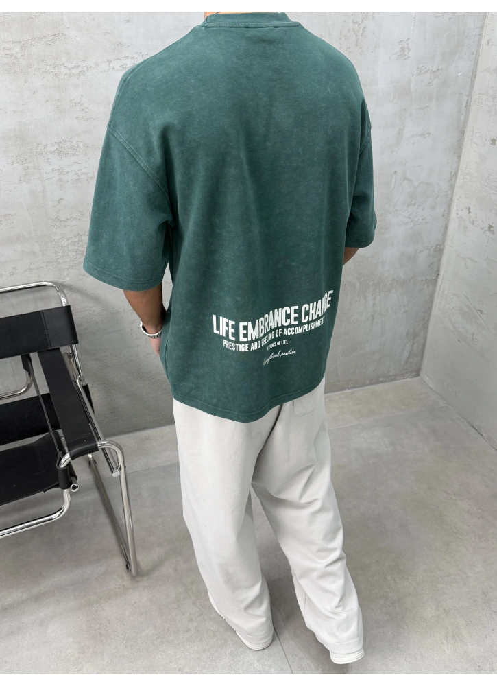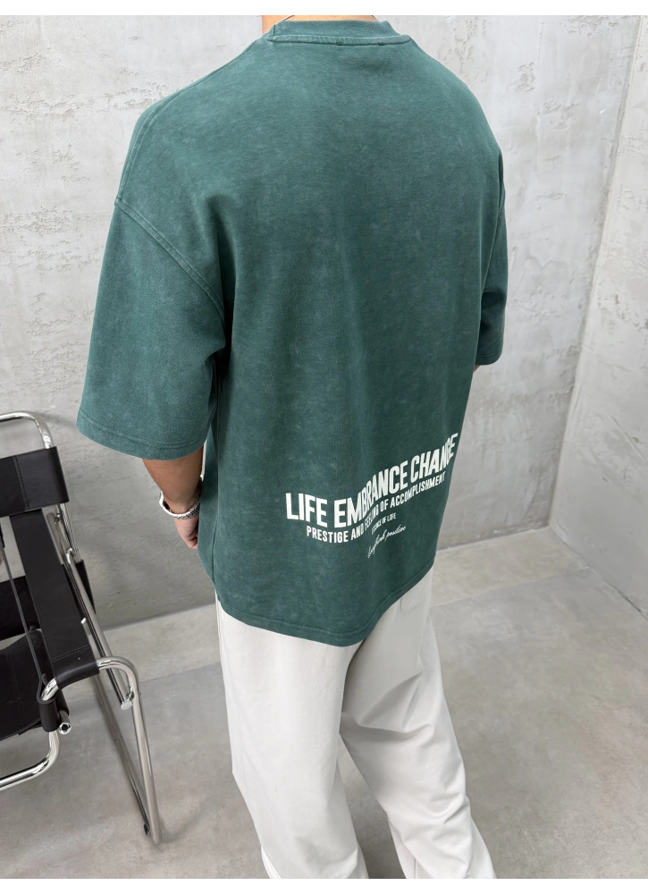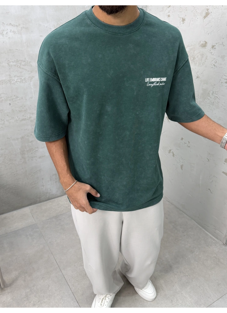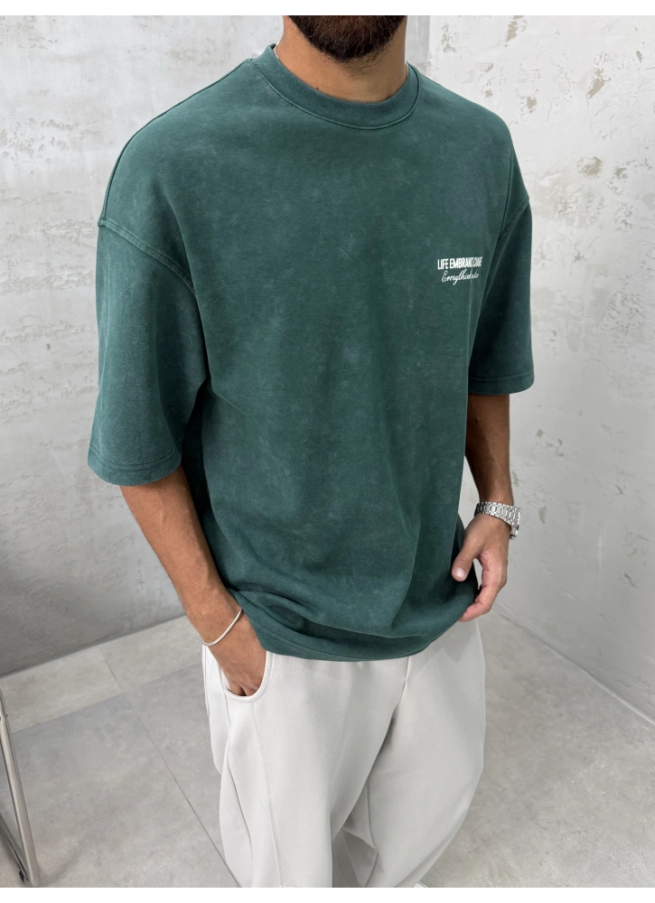 Doğal yeşil tonları ve yıkamalı dokusuyla öne çıkan oversize t-shirt.