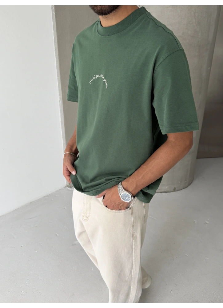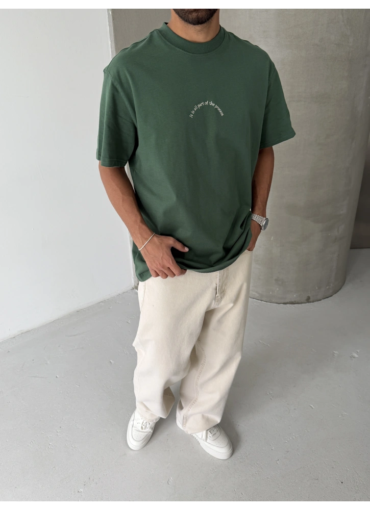Yeşil tonu ve dikkat çeken “Process” detayıyla öne çıkan bu oversize t-shirt, geniş kesimiyle gün boyu konfor sunar. Doğal rengi ve modern tasarımıyla kombinlerine fresh ve stil sahibi bir hava katar.