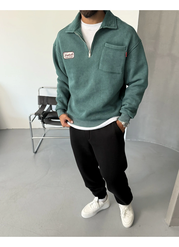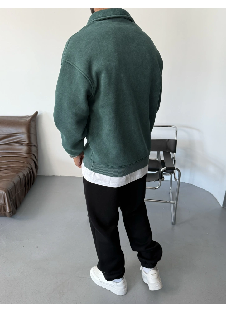 Yeşil Yıkamalı Yarım Fermuar Oversize Sweat