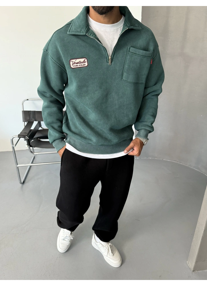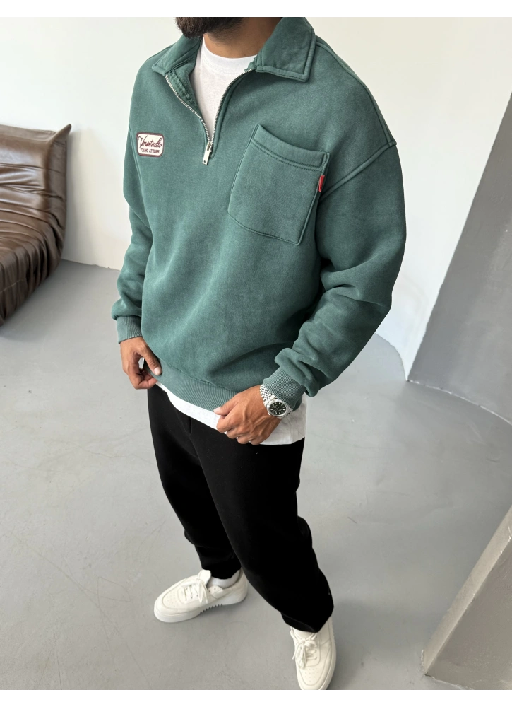 Yeşil Yıkamalı Yarım Fermuar Oversize Sweat Hakkında